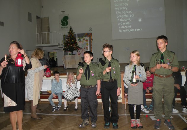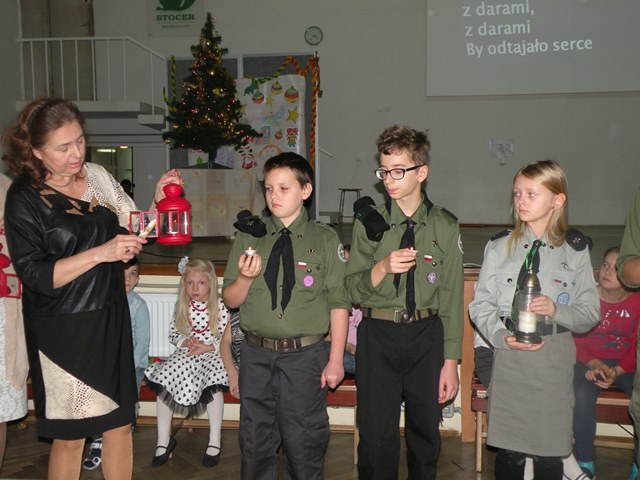 Atrakcji nie było końca. Po Jasełkach naszą szkołę odwiedzili Harcerze z 27 Konstancińskiej Drużyny Harcerskiej "Watra" i przekazali na ręce Pani dyrektor Zofii Wojciechowskiej Betlejemskie Światełko Pokoju.