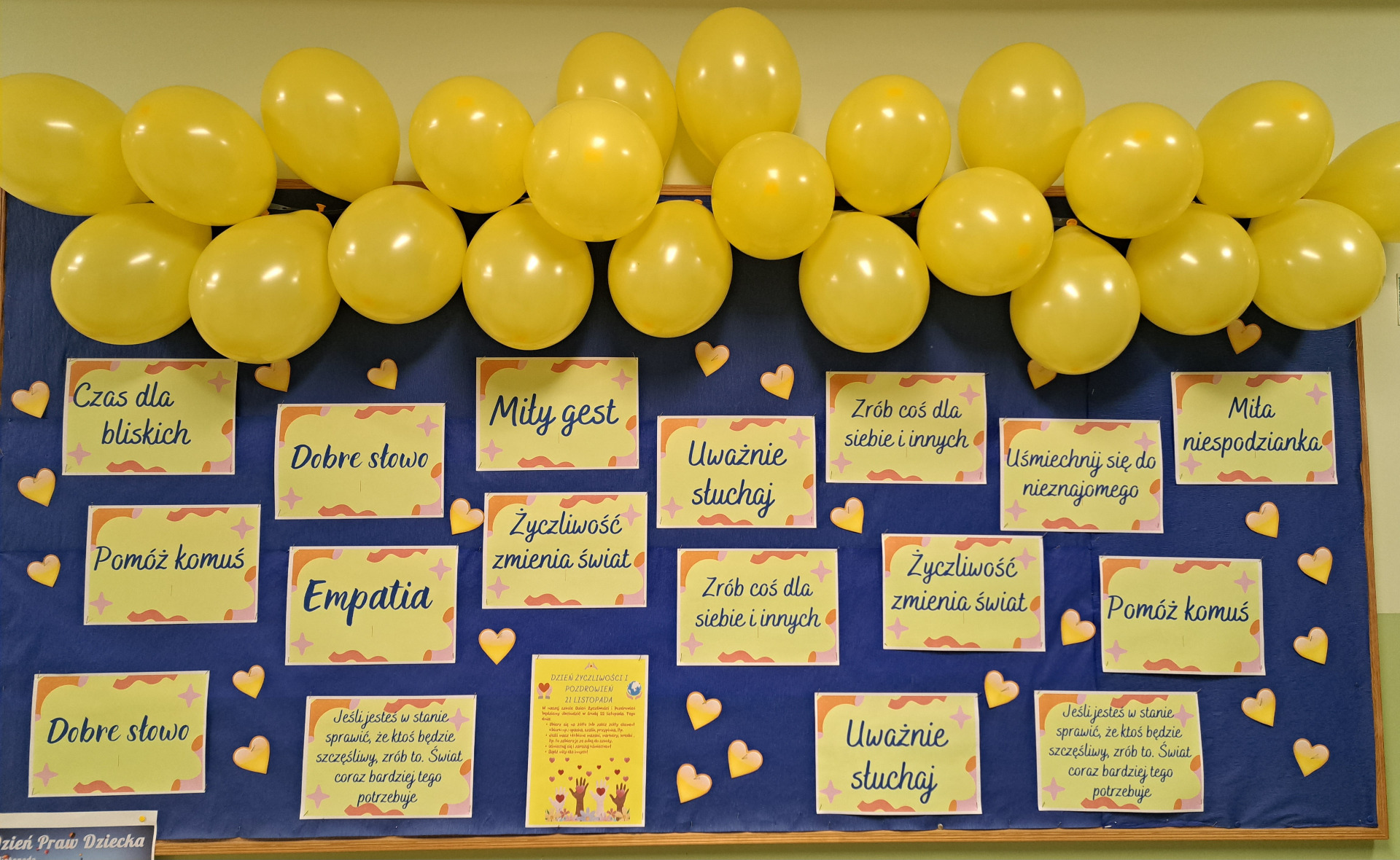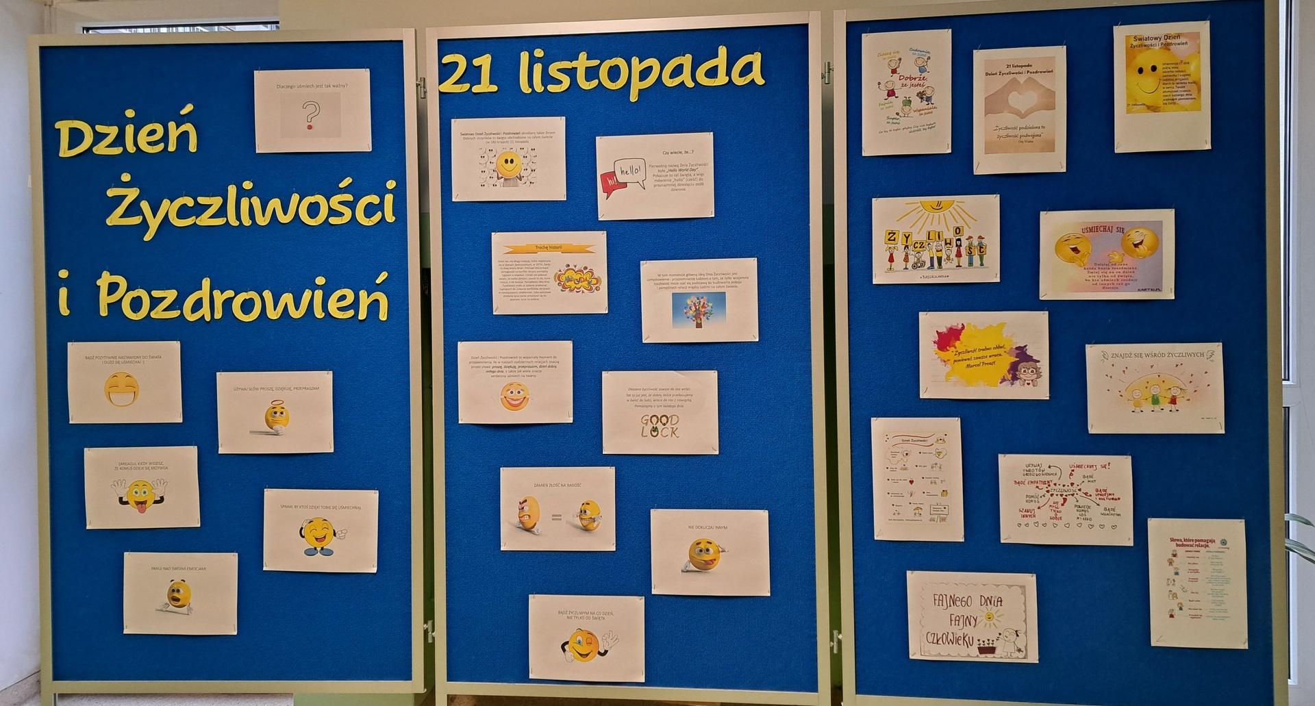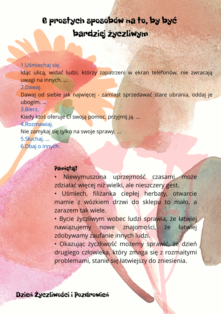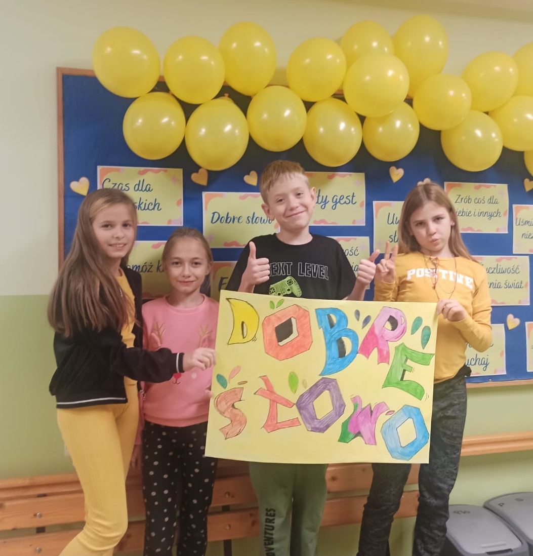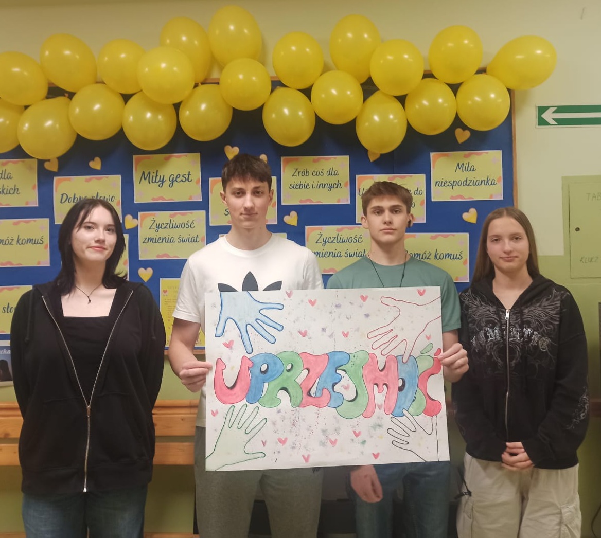 Przekonaliśmy się o tym sami, organizując obchody tego dnia w naszej szkole. Chętne osoby ubrały się na żółto i wymieniały się serdecznościami. Chłopcy z liceum wcielili się w przedstawicieli Poczty Życzliwości i mieli dla wszystkich listy pełne miłych słów. Zadaniem każdej klasy było wykonanie plakatu. Uczniowie na początku zajęć losowali „życzliwe słowo”, które mieli napisać na dużym arkuszu inspirując się graffiti. Powstały wyjątkowe prace, ich autorzy zwracali uwagę na kolorystykę, kształty liter i dodatkowe elementy, które dodały ich projektom charakteru – wszystkie zdobią nasz korytarz szkolny.