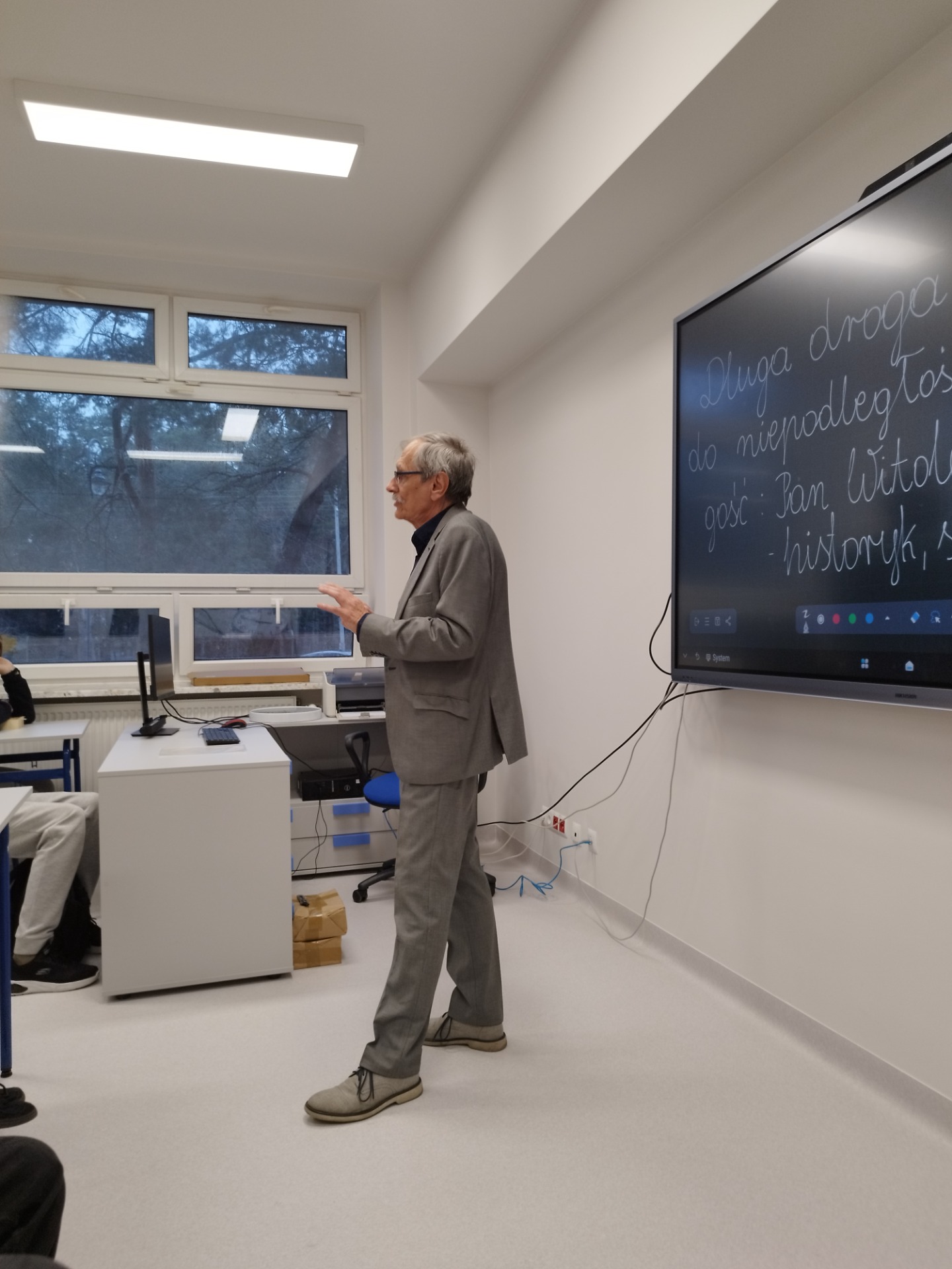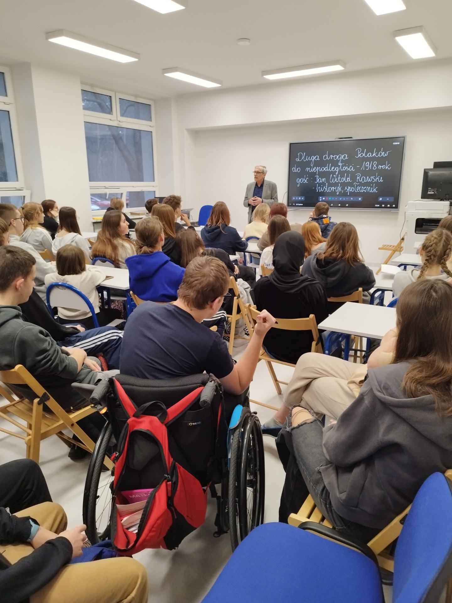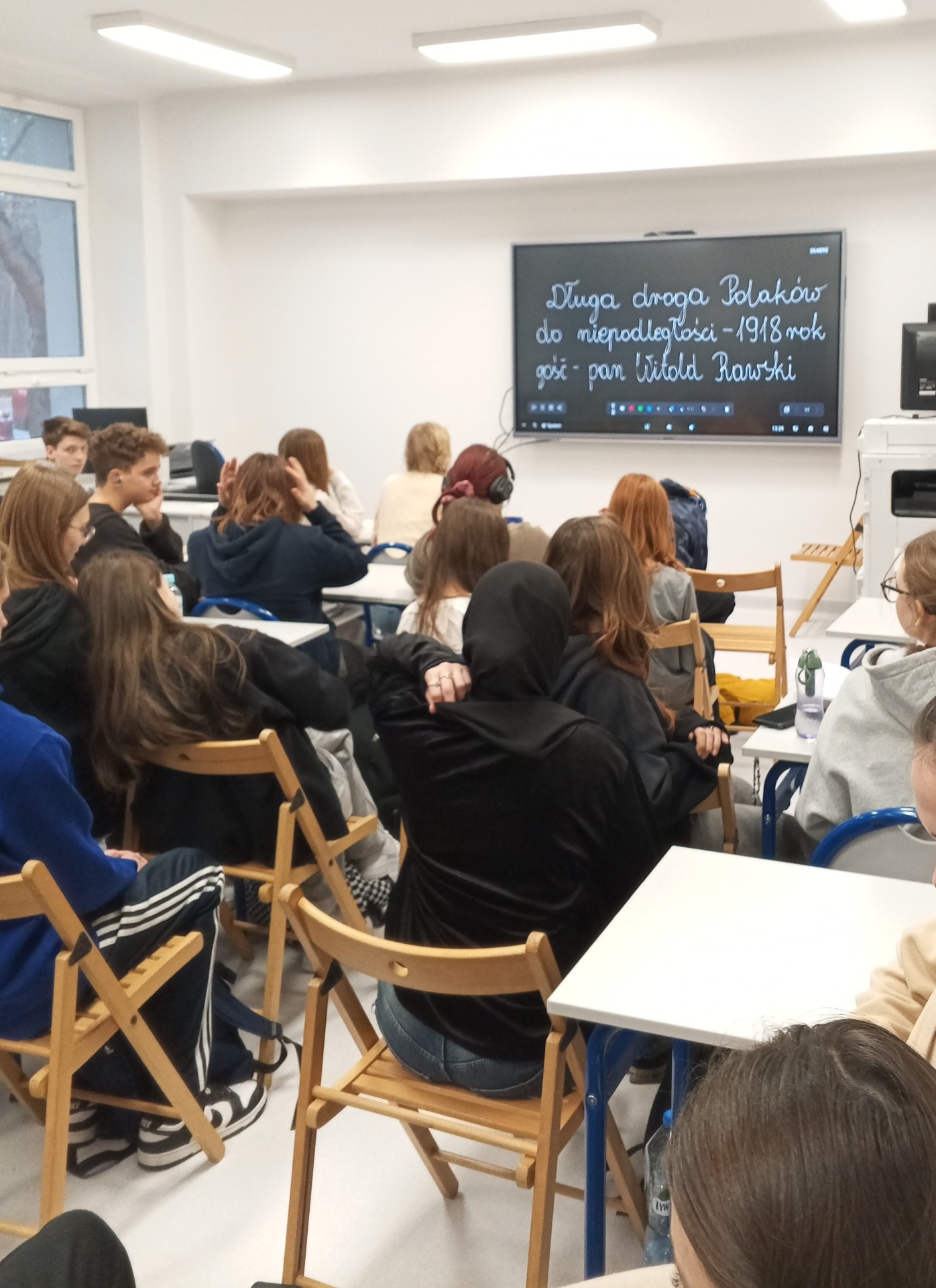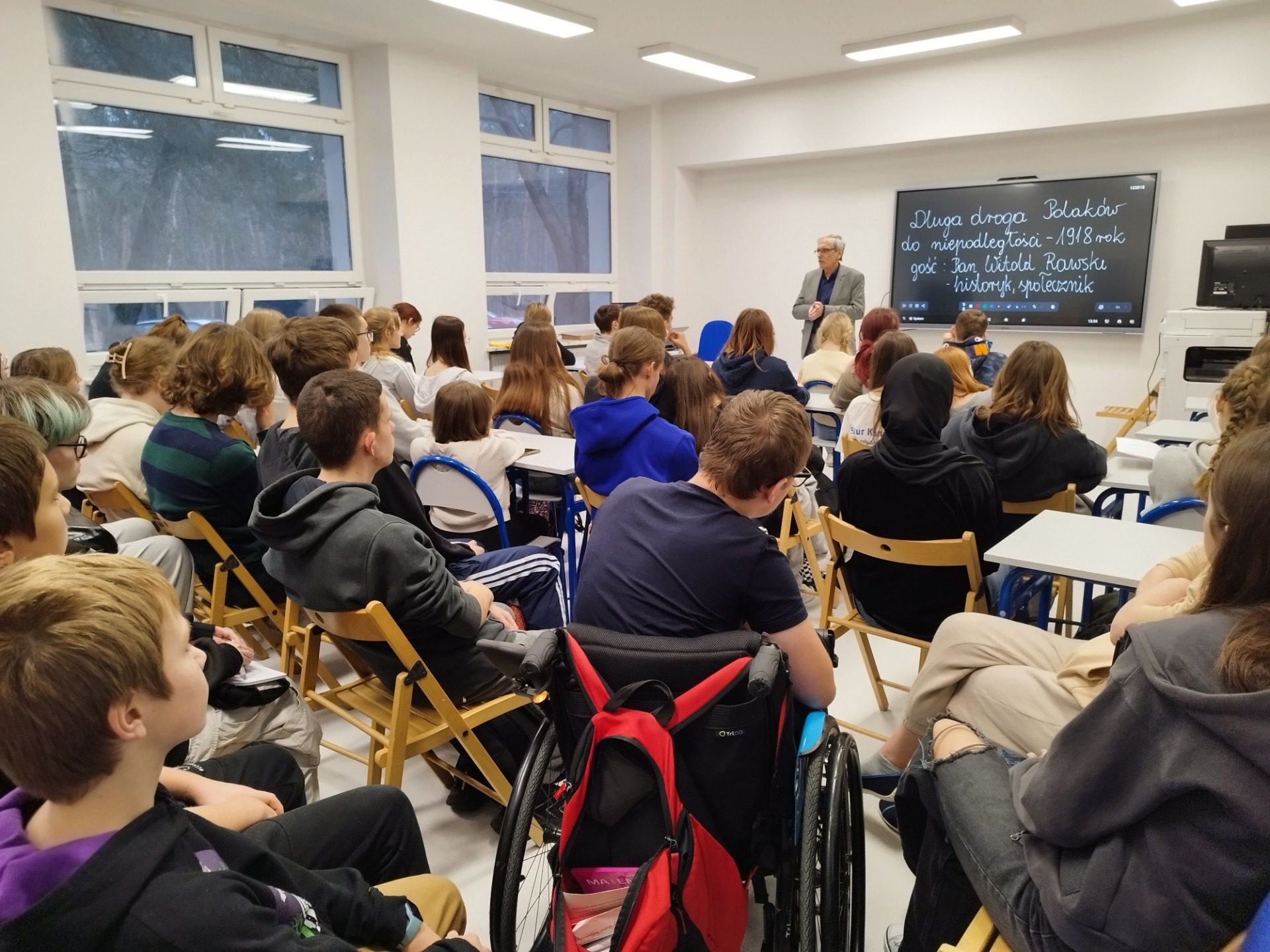 Listopad dla nas Polaków jest miesiącem szczególnym. Świętujemy odzyskanie niepodległości w 1918 roku po wielu latach niewoli. Jak trudna i długa to była droga, opowiedział na spotkaniu z młodzieżą pan Witold Rawski - historyk, społecznik i mieszkaniec Konstancina-Jeziorny. Gość skupił się przede wszystkim na roli dziewcząt i chłopców (rówieśników naszych uczniów) z Konstancina-Jeziorny i okolic, którzy zakładali tajne kółka i organizacje patriotyczne jak np. pierwszą żeńską drużynę harcerską im. Adama Mickiewicza. Opowiedział o roli w tworzeniu się zalążków niepodległości oraz ich konsekwencjach w razie wykrycia takiej działalności przez zaborców. Dziewczyny zdobywały pieniądze na papier do druku ulotek, organizowały tzw. tajne komplety, dbały o groby poległych za ojczyznę. Chłopcy, tak jak dziewczęta, oprócz poznawania literatury i sztuki polskiej uczyli się terenoznawstwa i obsługi broni, ćwiczyli tężyznę fizyczną. W razie wykrycia działalności im i ich rodzinom groziło więzienie, a nawet śmierć. Gość zachęcił uczniów do rozmów z rodzicami, dziadkami i pradziadkami, którzy mają dużą wiedzę na temat związany z prelekcją.