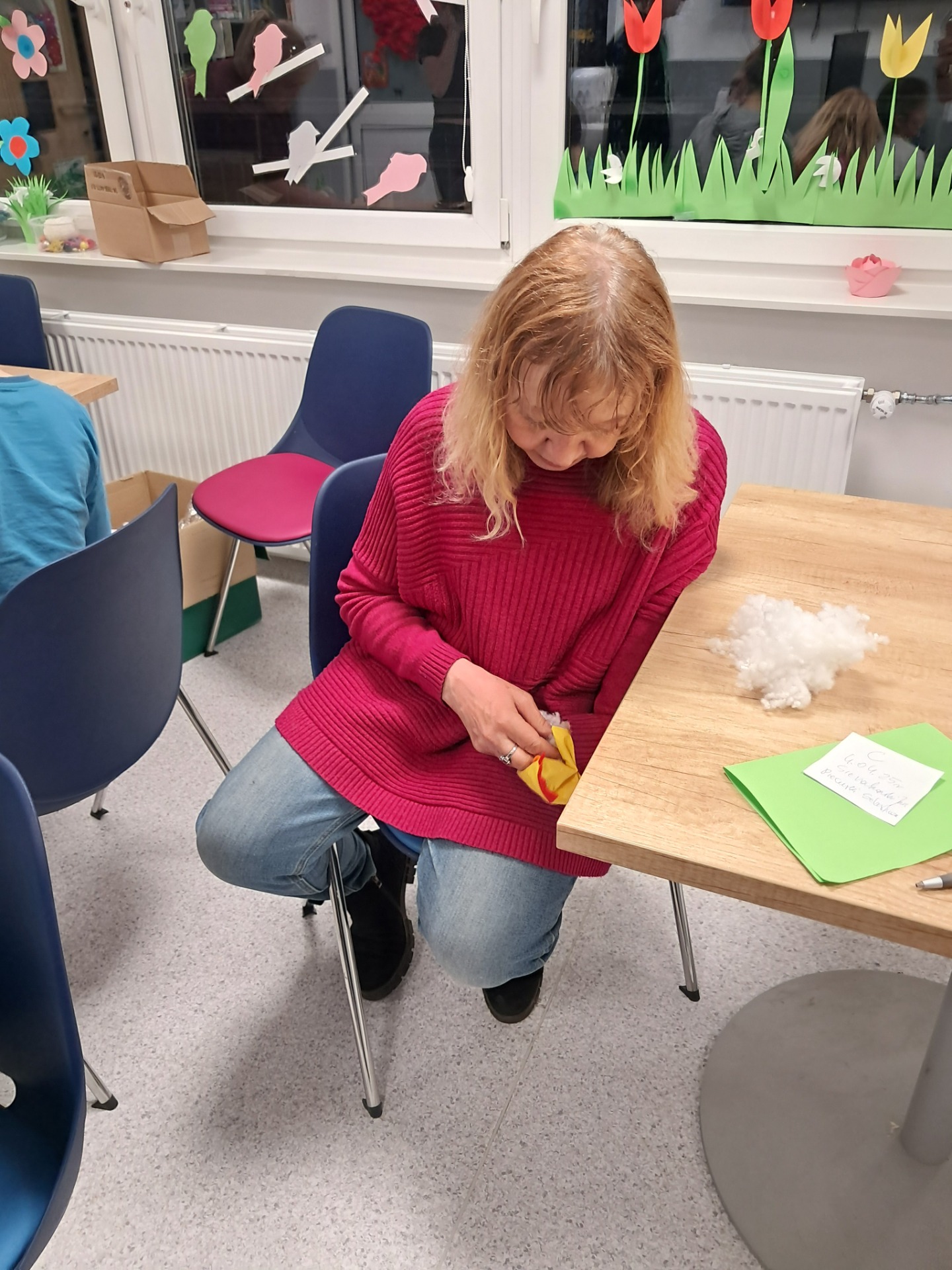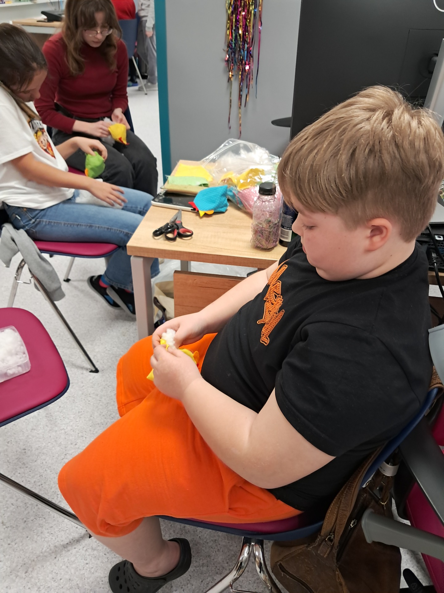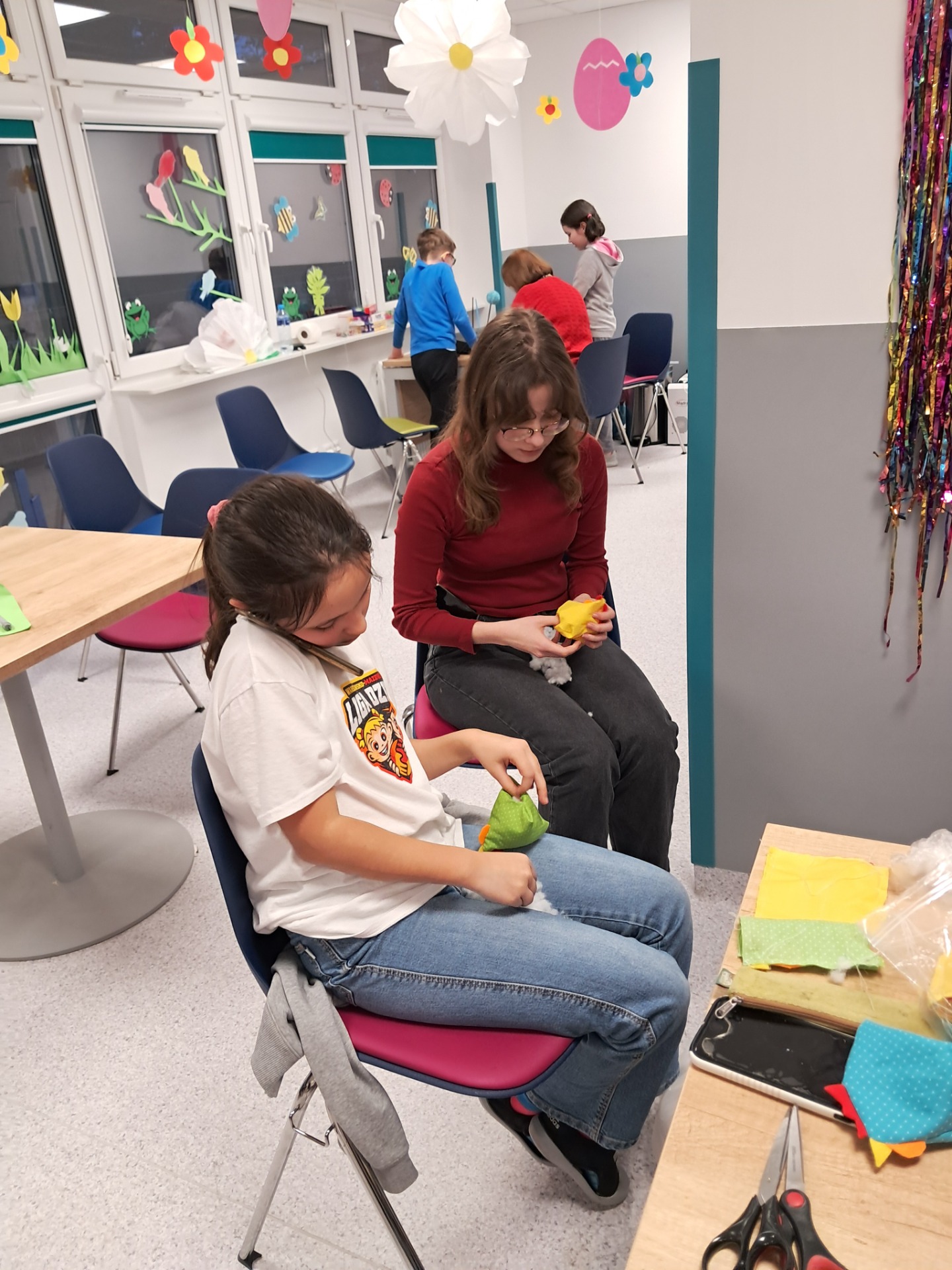 Równolegle trwała praca nad upominkami dla gości, którzy zaszczycili nas swoją obecnością podczas jubileuszu 50-lecia Szpitala. Tym razem uczniowie z wychowawcami tworzyli ozdoby z prostokątów delikatnej bawełny, miękkiego wypełnienia z kulki silikonowej, filcu, igieł i nici. Z zapałem zszywali i wypychali urocze, puszyste kurczaczki. Każdy etap pracy – od wycinania elementów, przez zszywanie, aż ponadawanie ostatecznego kształtu – wykonywany był z dużym zaangażowaniem. Praca przebiegała sprawnie dzięki podziałowi na mniejsze zespoły, co sprzyjało współpracy i wymianie pomysłów. Podczas zajęć nie zabrakło również czasu na swobodne rozmowy. Wychowankowie chętnie dzielili się swoimi rodzinnymi tradycjami wielkanocnymi, opowiadali o ulubionych zwyczajach i potrawach,