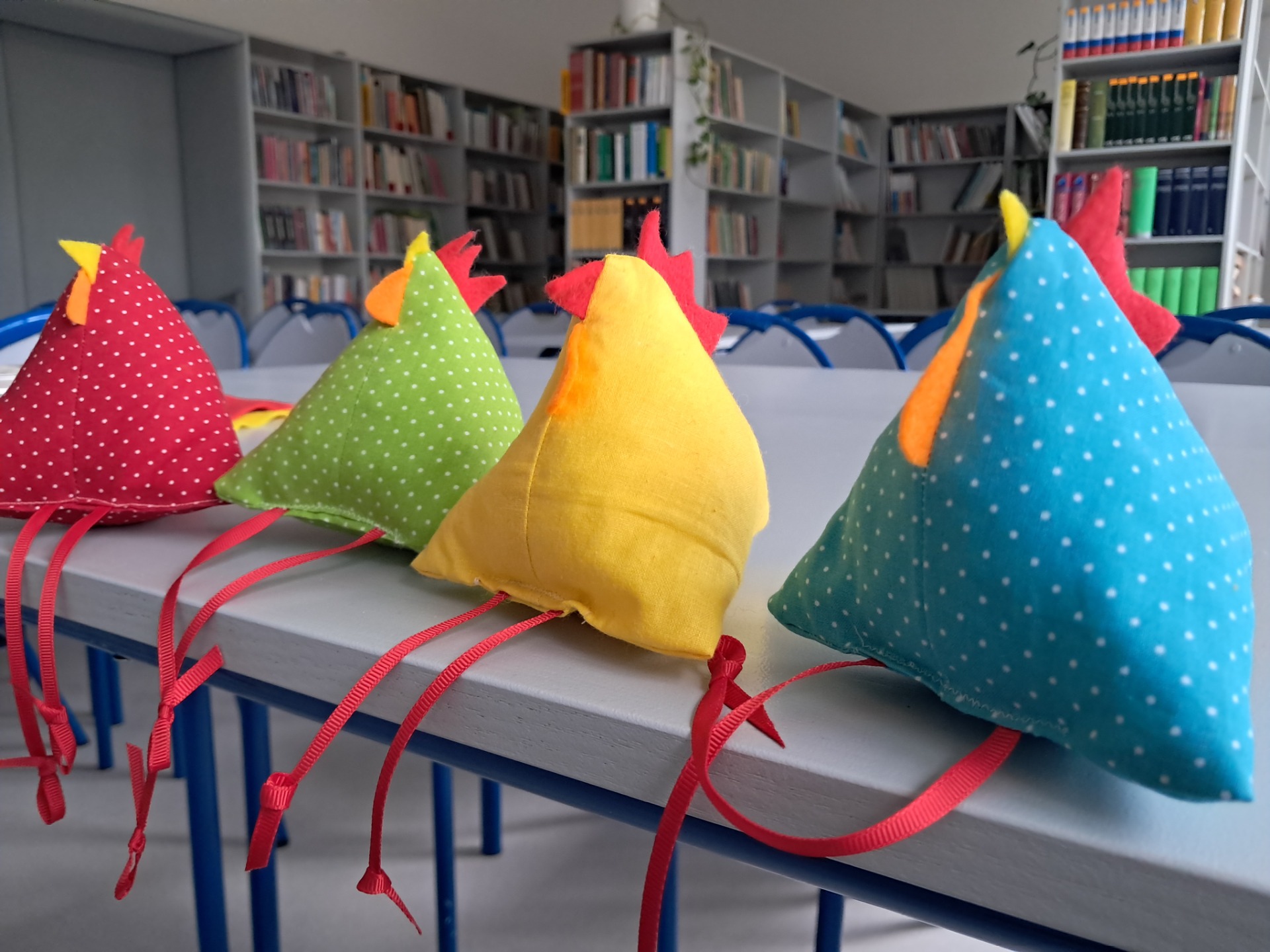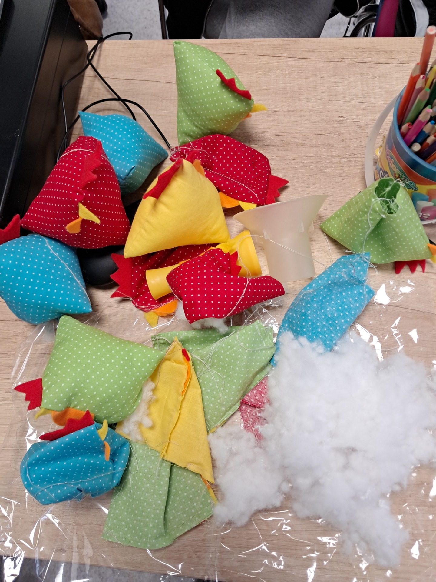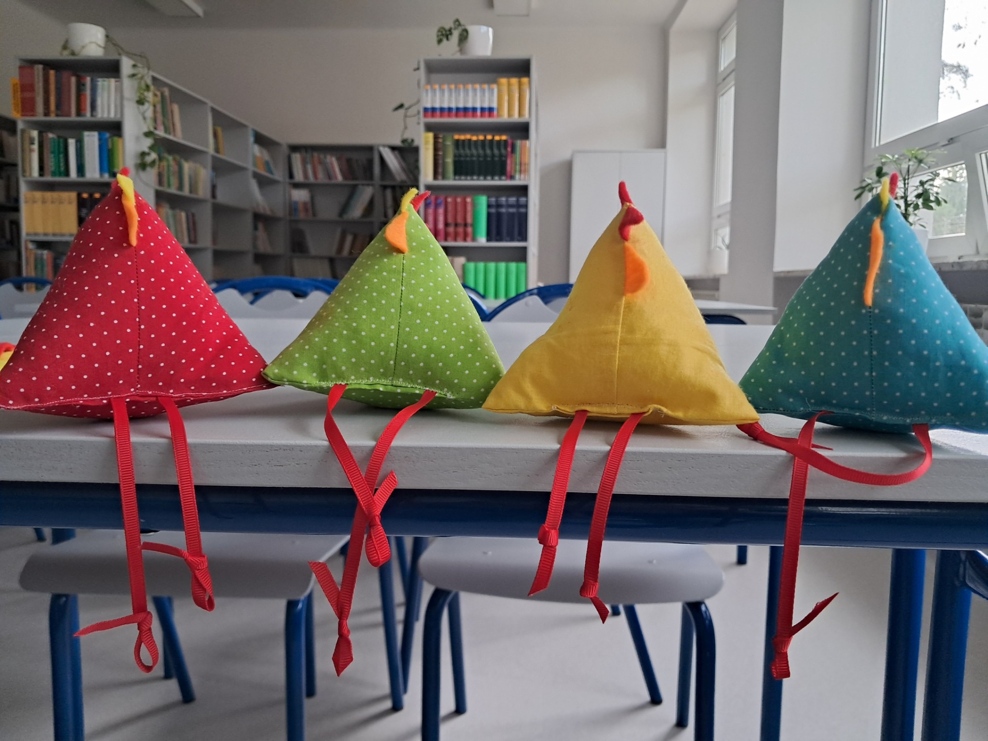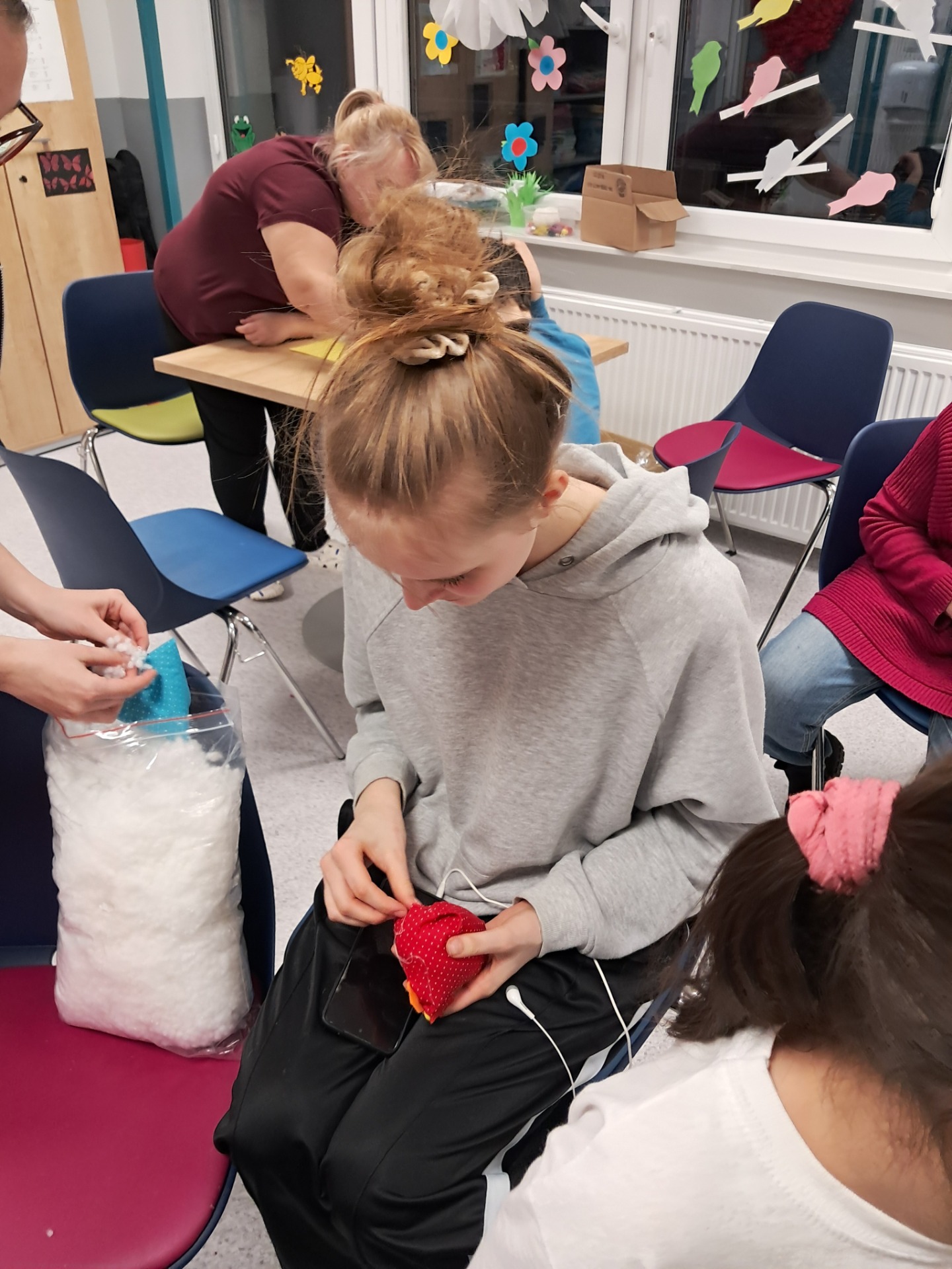 Równolegle trwała praca nad upominkami dla gości, którzy zaszczycili nas swoją obecnością podczas jubileuszu 50-lecia Szpitala. Tym razem uczniowie z wychowawcami tworzyli ozdoby z prostokątów delikatnej bawełny, miękkiego wypełnienia z kulki silikonowej, filcu, igieł i nici. Z zapałem zszywali i wypychali urocze, puszyste kurczaczki. Każdy etap pracy – od wycinania elementów, przez zszywanie, aż ponadawanie ostatecznego kształtu – wykonywany był z dużym zaangażowaniem. Praca przebiegała sprawnie dzięki podziałowi na mniejsze zespoły, co sprzyjało współpracy i wymianie pomysłów. Podczas zajęć nie zabrakło również czasu na swobodne rozmowy. Wychowankowie chętnie dzielili się swoimi rodzinnymi tradycjami wielkanocnymi, opowiadali o ulubionych zwyczajach i potrawach,